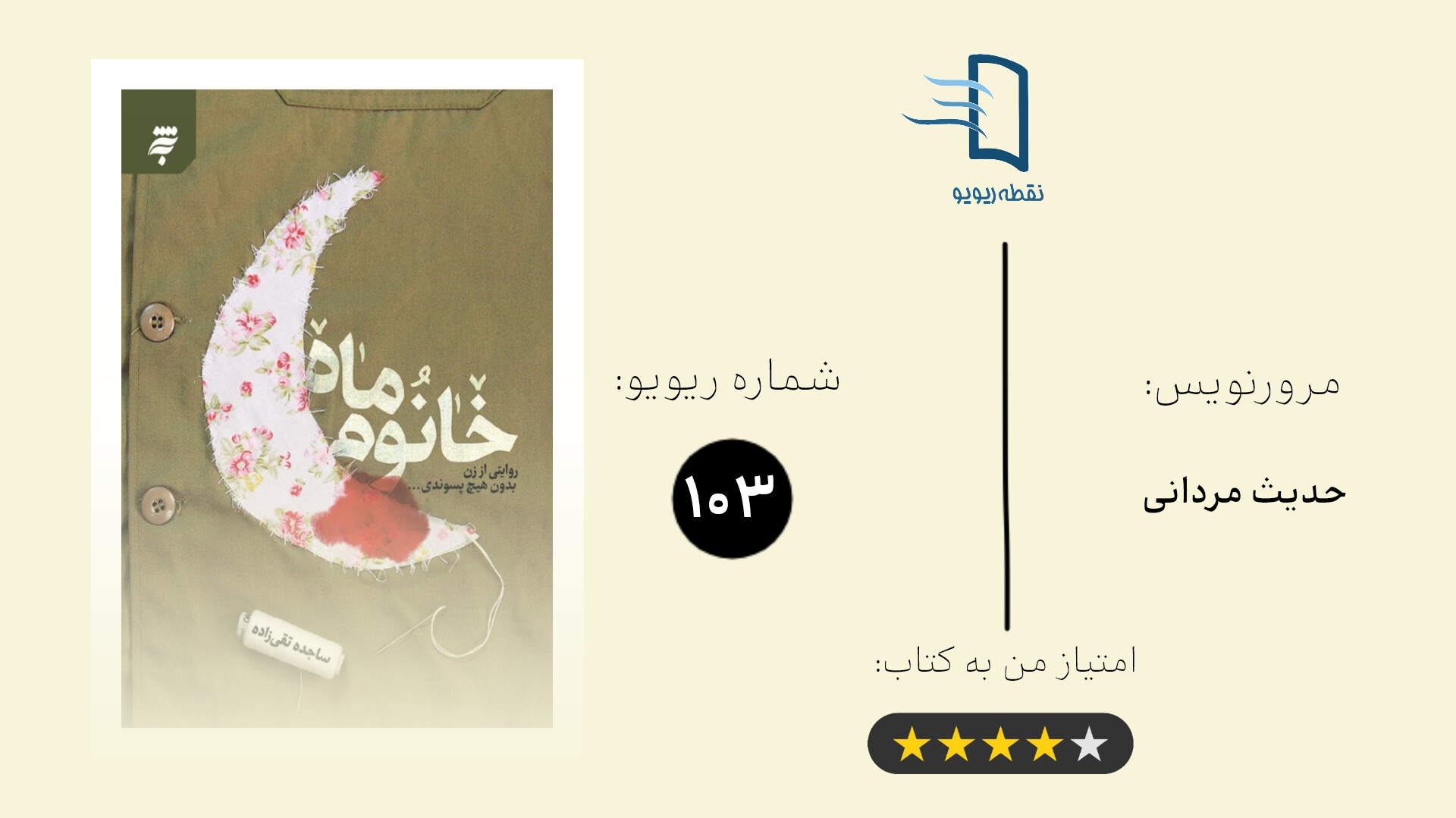 زندگی خانومناز پر از درس است، درس حیا، عشق، صبوری، توکل، اعتماد به خدا و ایستادگی و قوی بودن با وجود تمام مشکلات و موانع. اگر دلتان یک روایت صادقانه و احساسی از یک زندگی مجاهدانه میخواهد، خانوم ماه را بخوانید.